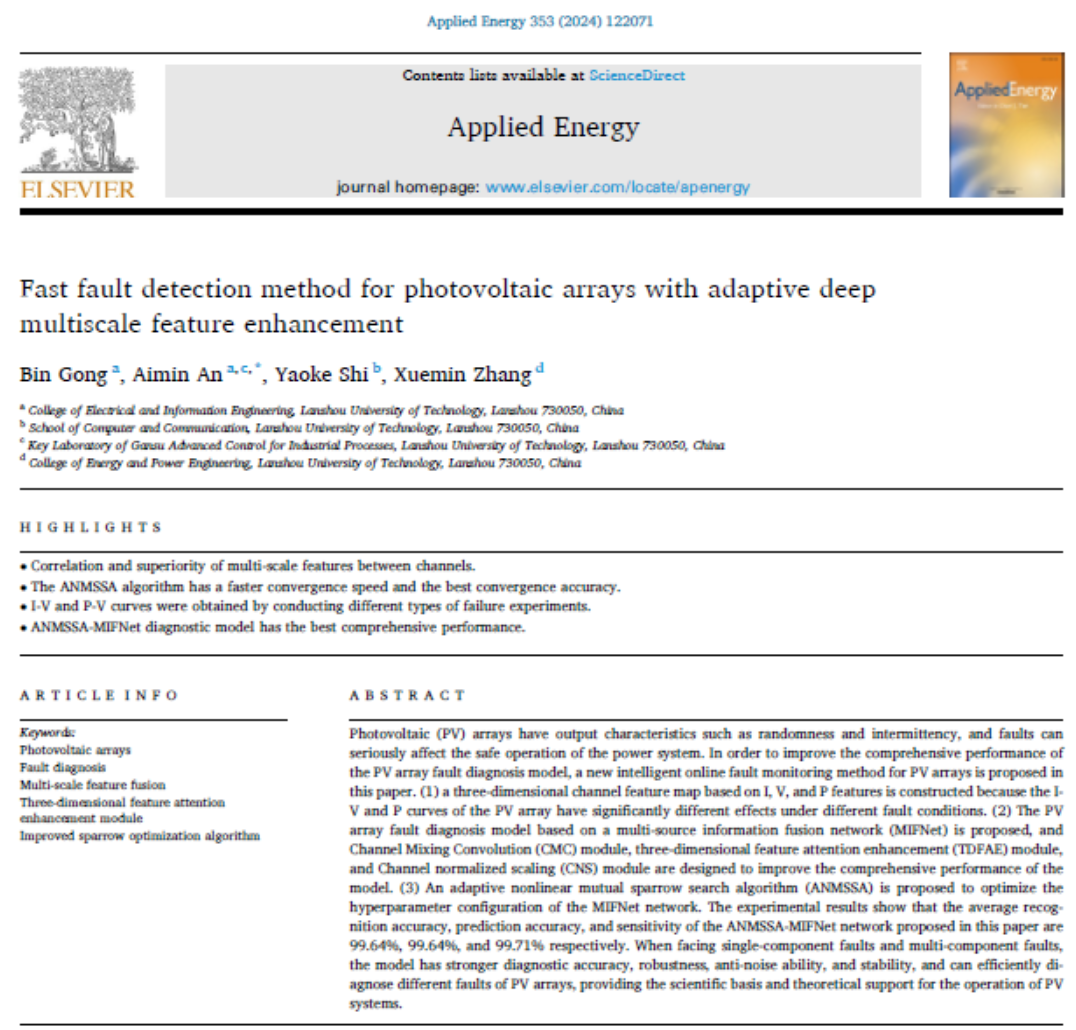 近日,电信公司自动化系安爱民教授团队的2022级博士生巩彬在能源和燃料领域国际知名Top期刊《Applied Energy》(世界能源领域著名学术SCI期刊, IF="11.446,CiteScore20.4,ESI全球工程期刊第4,中科院一区)在线发表题为“Fast fault detection method for photovoltaic arrays with adaptive deep multiscale feature enhancement”(作者:巩彬、安爱民、石耀科、张学民)的高水平论文。安爱民教授为论文的通讯作者,博士生巩彬为第一作者,2026年国际足联世界杯电气工程与信息工程公司为第一通讯单位。