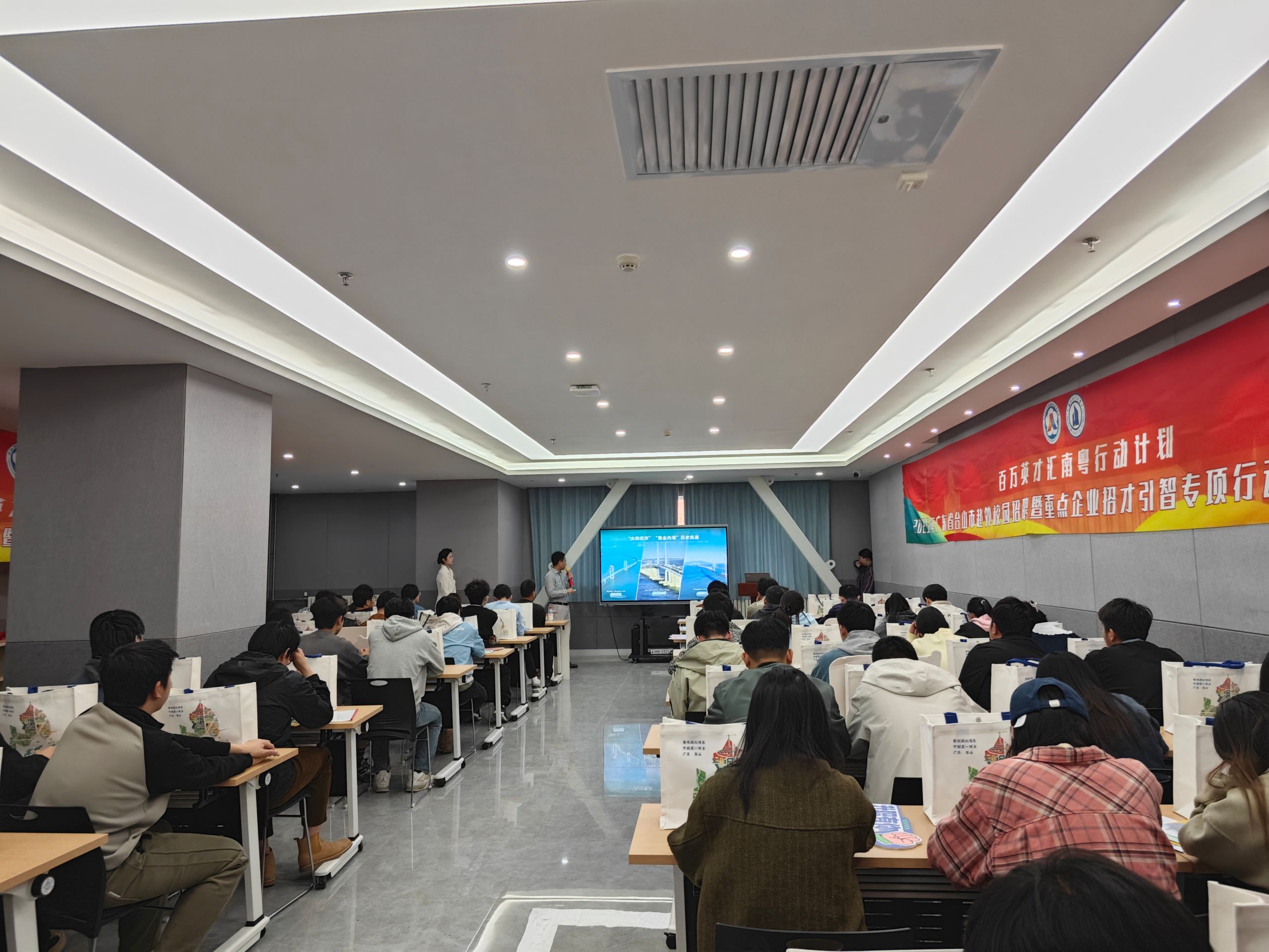 4月16日上午,台山市人力资源和社会保障局就业创业促进股股长苏惠武、全国博士后创新(江门)示范中心台山分中心主任李星元一行10人率队来校进行人才交流座谈并举行现场人才招聘会,员工就业创业服务中心副主任宋婵、电信公司党委副书记刘炜,材料公司、机电公司辅导员参加了座谈会。会议由刘炜主持。